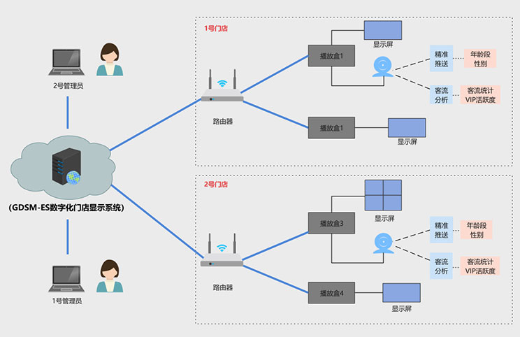 该客户为宁波地区零售门店,在一段时间内,客户发现门店销售额持续下滑,但是不知道原因出在哪里,到底是消费者减少,还是广告推送出现问题,亦或是其他原因,客户没有头绪,星空科技数据化门店显示系统完美的解决了客户痛点,方案拓扑图如下:
