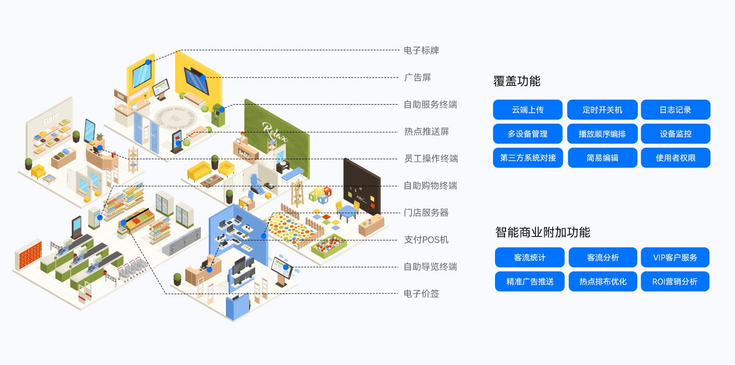 星空智慧零售解决方案搭配星空GDSM-ES智能零售管理系统,为全球零售门店客户提供了功能齐全的数字化运营管理工具,提供广告显示信息编辑、信息发布、AI识别、客户分析和会员管理等功能,实现对设备、内容、营销、运营的综合数智化管理能力,为精准运营管理赋能。