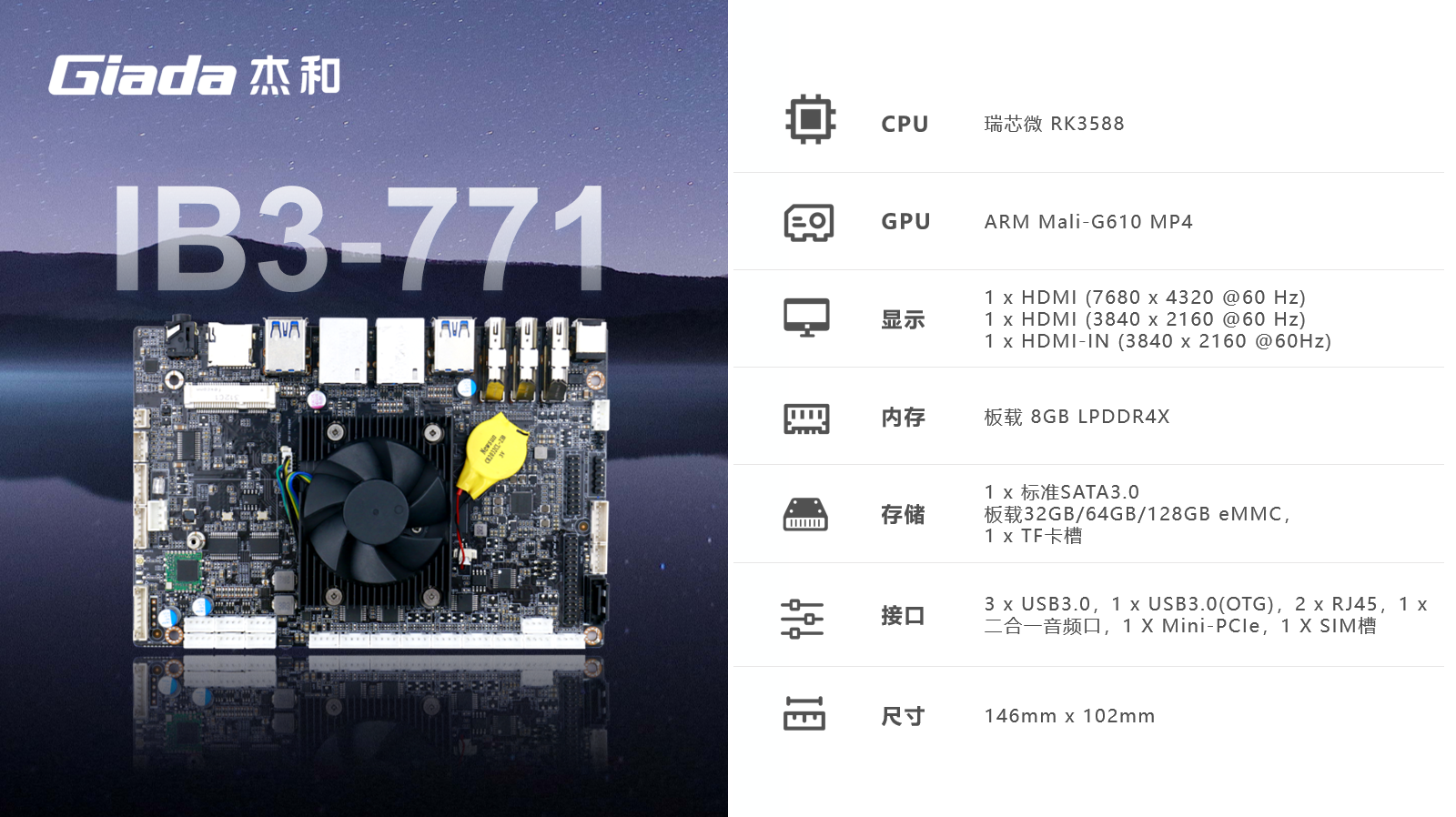 星空ARM主板IB3-771采用瑞芯微RK3588(4*A76+4*A55@2.4GHz)八核64位处理器,集成ARMMali-G610 MC4 GPU,内置AI加速NPU,提供6TOPs算力,板载8GB LPDDR4X内存,支持8K@60fpsH.265/VP9视频解码和8K@30fps H.264视频编码,进行图像及视频的高效采集和处理,可广泛应用于交互式智慧显示屏、智慧显示一体机、智能自助终端等场景。