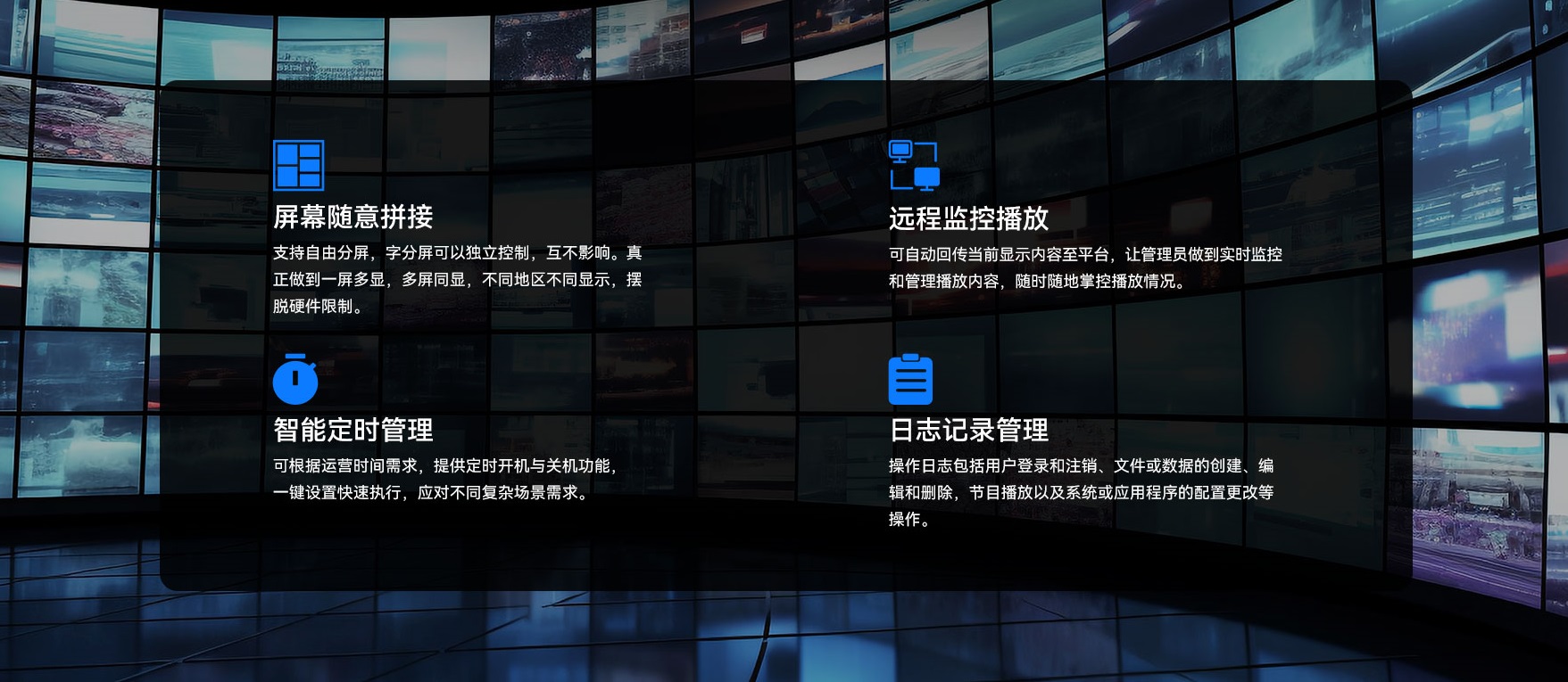 星空GDSM-ES智能零售管理系统可 实现多屏拼接/多屏分离自由选择,也可画中画显示,用户可根据场景自行灵活安排,更可以异形屏幕显示安排,让广告显示更加丰富多彩。同时,还可以轻松查看设备的基本信息,如连接状态、播放状态、播放到期时间,屏幕类型等;可对设备进行分组远程管理,远程设置定时开关机时间,控制设备音量,远程重启、远程升级,远程截屏查看实时画面等,实现屏幕智能管理。