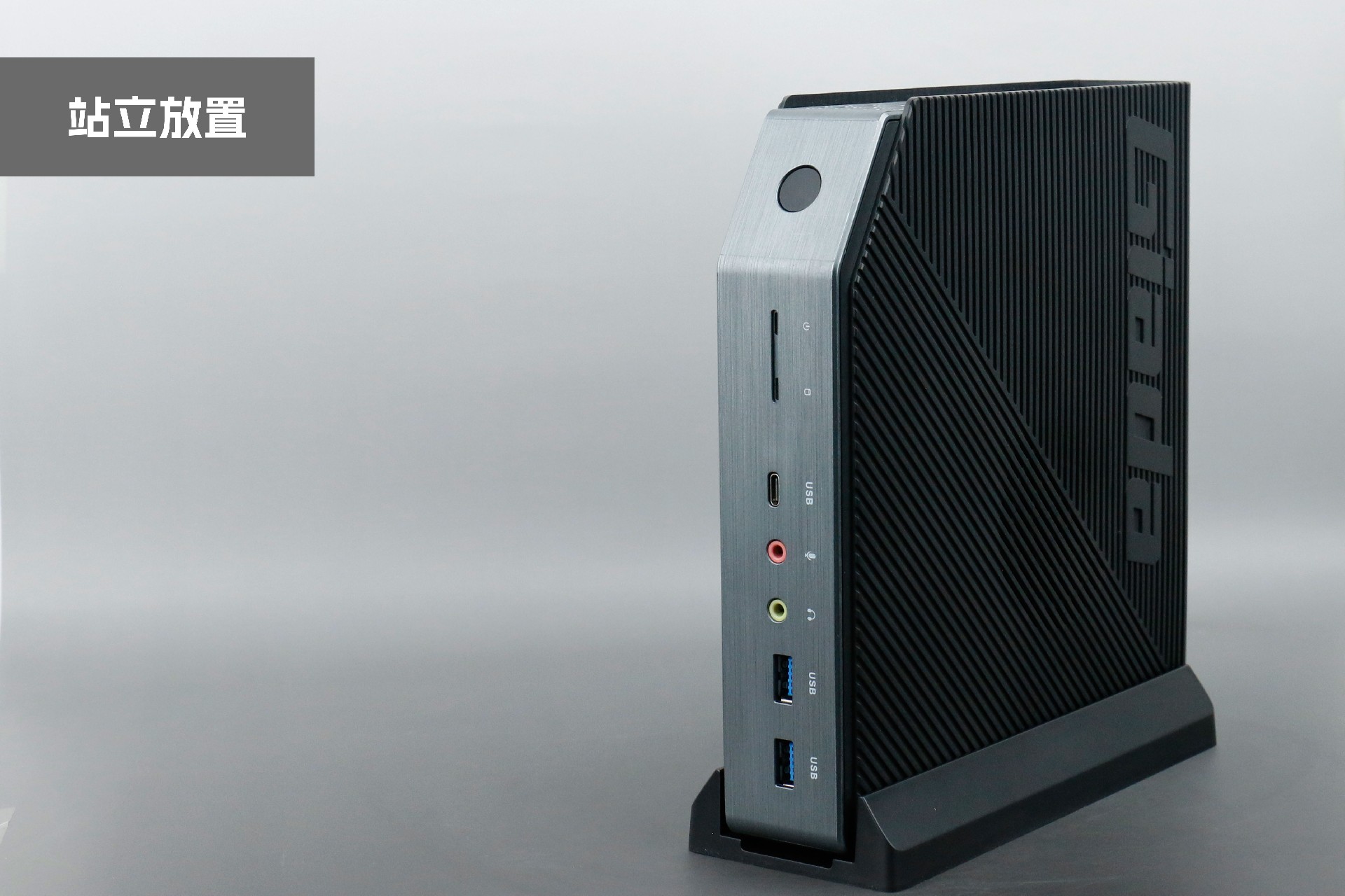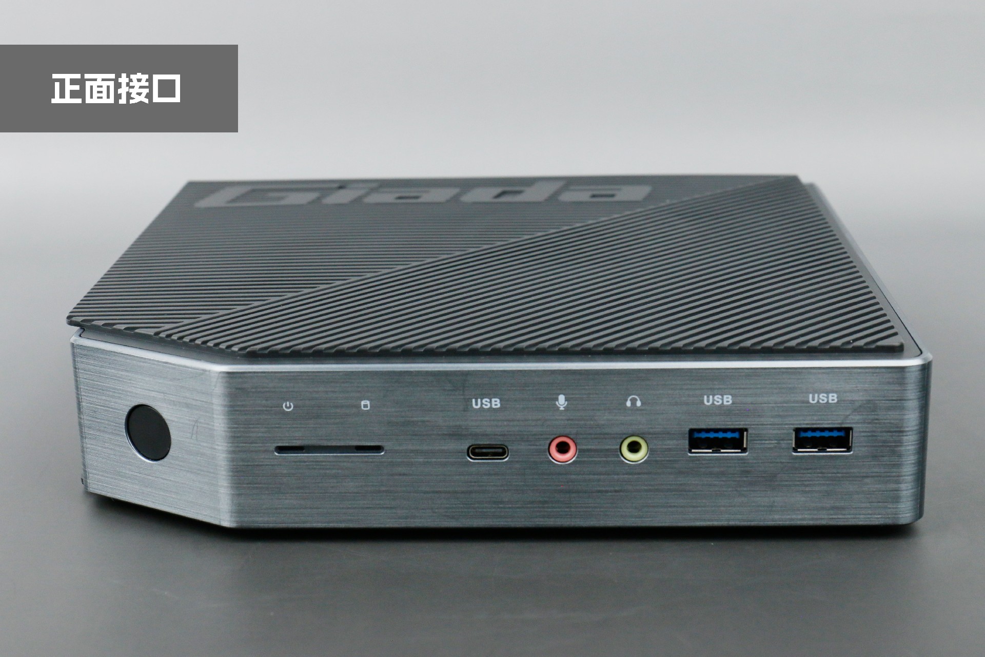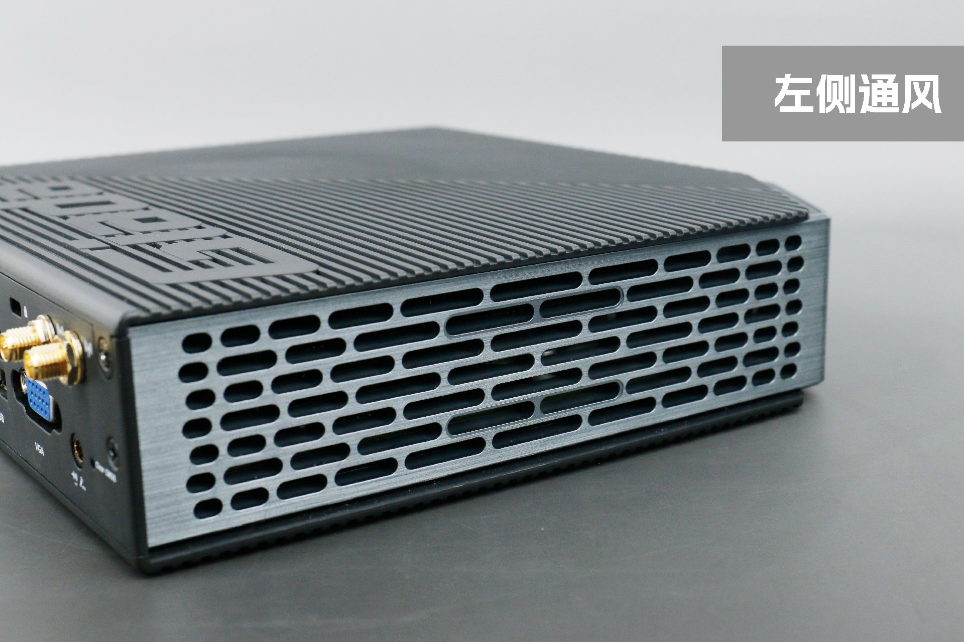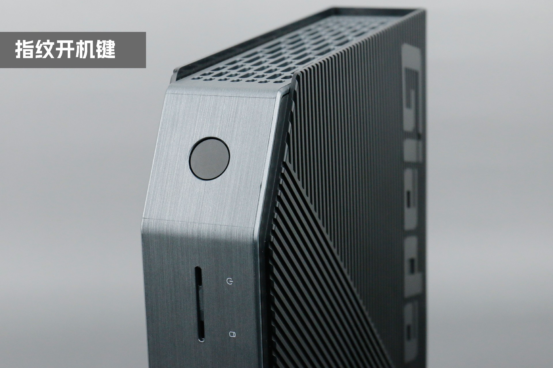 打开星空桌面云终端Y-BOX P3,你会发现它的结构并不是常见的四方体设计,而是在转角处好似被切割开一个角,切割出来的面积为指纹识别开机键。它的外观为优雅的银灰配色,机身正面厚重感十足,顶部依然沿用黑色哑光栅格并延伸至整机背面,磨砂塑胶材质壳,印刻星空Giada品牌名;其他三面则为银灰色,两侧是蜂窝式通风口设计。