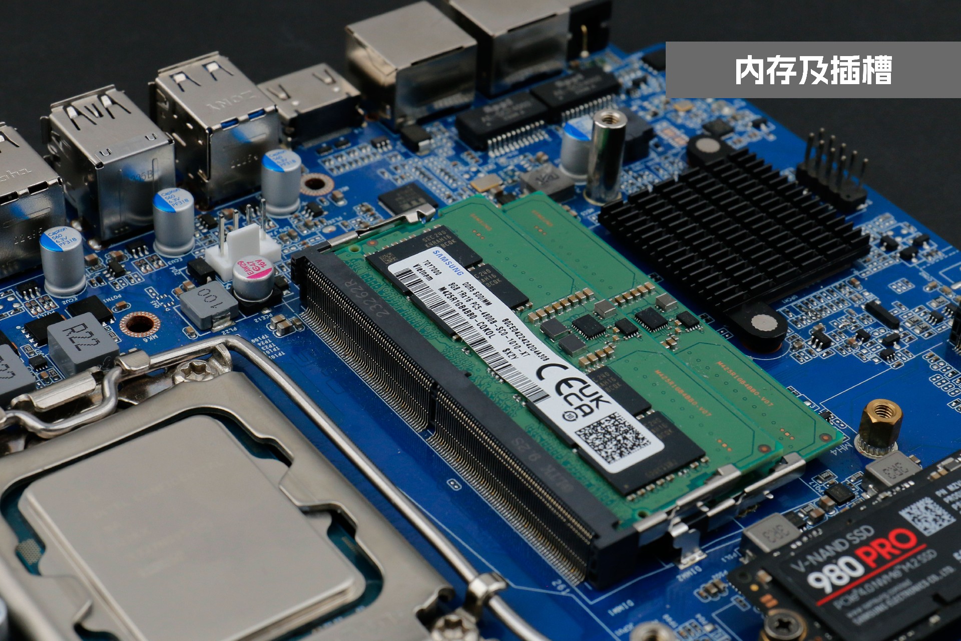 星空桌面云终端Y-BOX P3主板中部是内存插槽,采用双通道笔记本内存槽设计,最大支持容量可达64GB,最高支持DDR5-5600MHz频率,比 DDR4 至高标准数据速度 3200MT/S多传输 1.75 倍,横插的形式可以减少主板的占用体积,使整体机身更紧凑,内存顶部的风扇起到高效散热的作用。