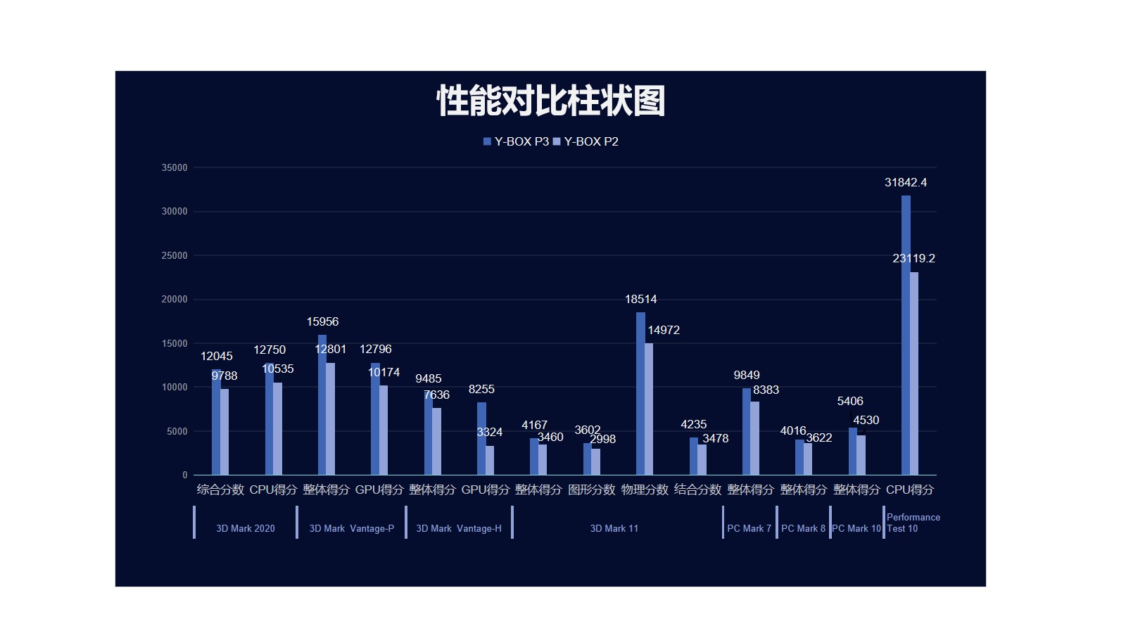 星空来具体看看各个测试项目的跑分情况,星空分别用3D Mark、PC Mark以及Performance 10等不同系列不同软件进行跑分,测试项目涵盖显示性能测试、系统性能测试、CPU性能测试等。通过下面的表格及柱状图可以看出,星空桌面云终端Y-BOX P3的数据在各项性能上都得到了大幅度提升。