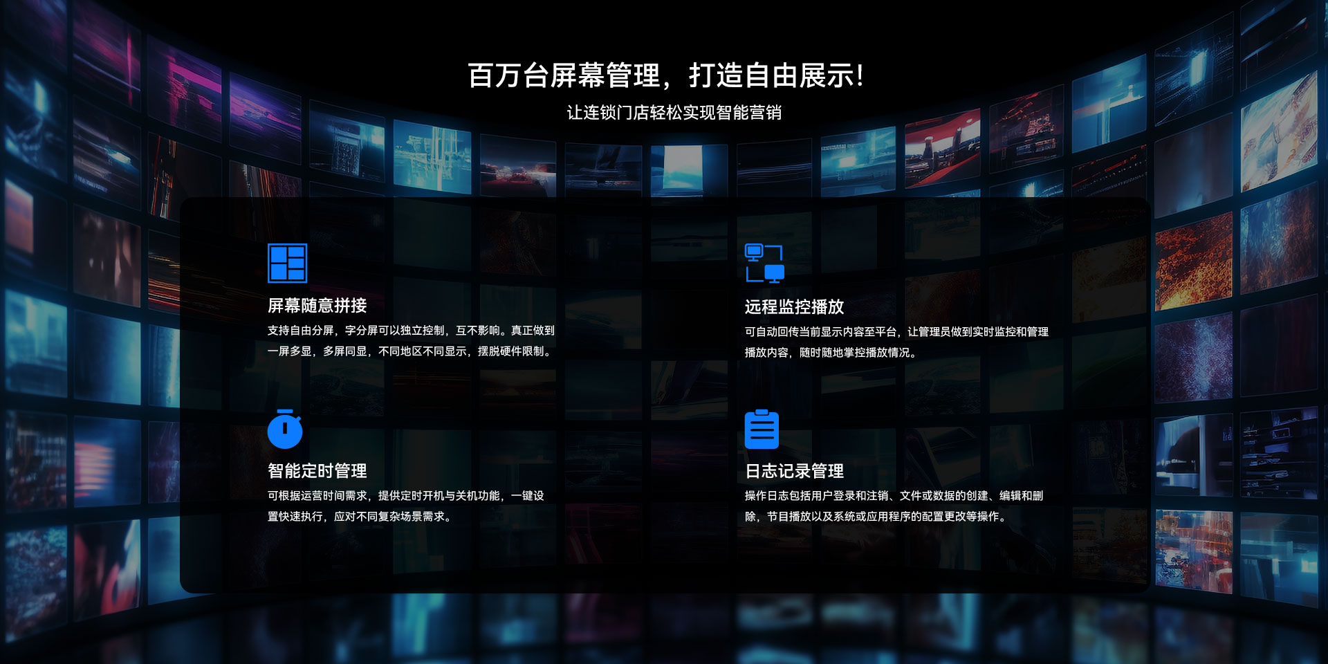 目前星空科技GDSM-ES系统覆盖市场上多形态网络智能显示终端,满足行业全产品业态需求,如广告机、LED显示屏、LCD拼接屏 、普通液晶电视等各种显示终端,广泛用于广告宣传、通知公告、指示引导。