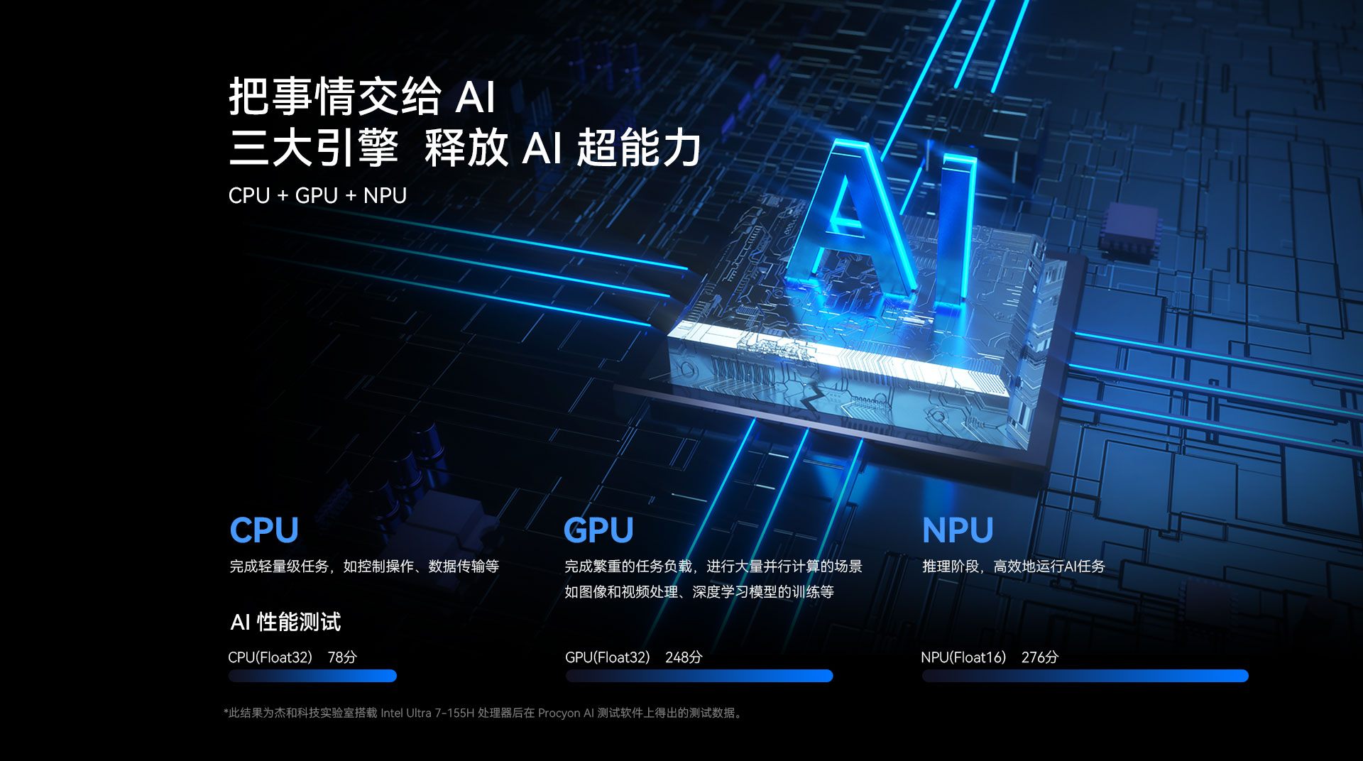 星空科技N601搭载了Intel® Core™ Ultra处理器,可选配Ultra 5- 125H或Ultra 7-155H,全新架构拥有CPU、GPU 和NPU配置。在星空科技实验室里,星空专门用 Procyon AI 这款 AI 性能测试软件对搭载了 Ultra 7-155H 处理器的 N601 进行了测试。最后测试结果显示,N601的CPU分数为78分,GPU 分数为248分,NPU分数为276分,这意味着N601在AI处理方面具有显著优势,能够高效地处理复杂的神经网络计算任务。