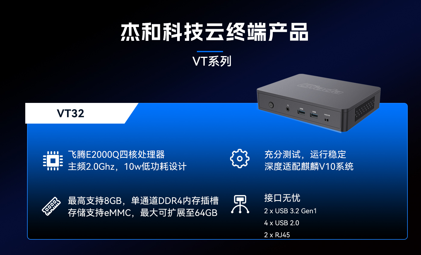 为响应信创趋势,星空科技推出了搭载国产芯片—飞腾E2000Q的云终端VT32,VT32与麒麟V10操作系统进行了深度适配,为用户打造出更加安全可信的解决方案。