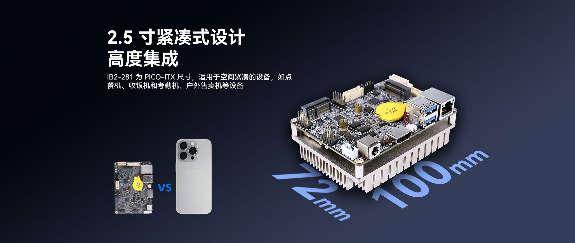 无风扇嵌入式主板去掉了风扇这一易损部件,消除了因风扇故障引发的系统问题,提高了系统的稳定性和可靠性。它采用了高度集成化的设计,体积更为小巧,如星空科技Pico-ITX主板IB2-281,其2.5寸紧凑式设计,适用于点餐机、收银机和户外售卖机等空间有限的应用场景。这种主板通常具备低功耗的特性,减少了能源消耗,也降低了发热。而且,它的稳定性极佳,能适应各种复杂环境。