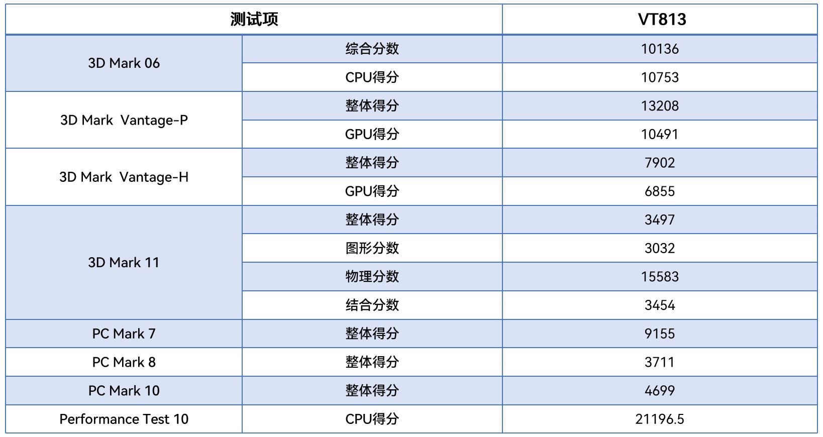 从不同测试软件的跑分情况可以看出,VT813在图形渲染、物理运算及整机综合性能等方面的整体表现优异,下面星空将针对具体的几项数据来进行详细分析解读。