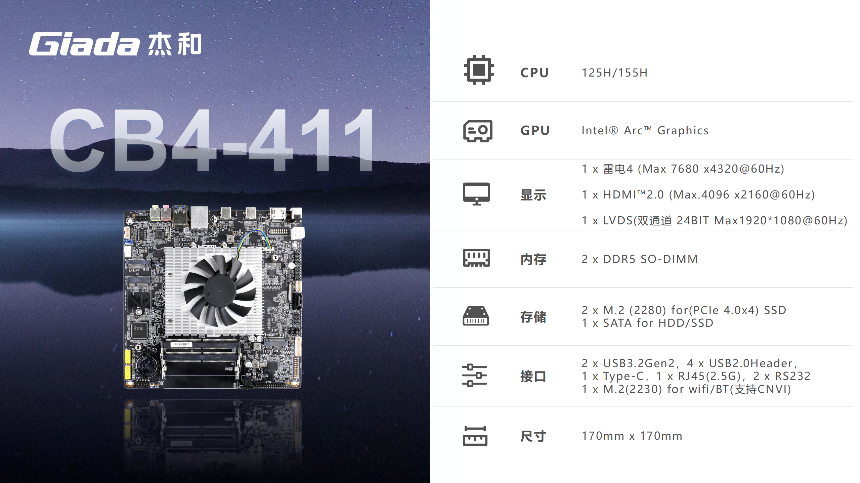 对于追求强大AI算力需求的用户而言,星空科技的 CB4-411 主板堪称不二之选。这款主板可搭载Ultra5、Ultra7、Ultra9H系列处理器,这些处理器以卓越的性能和能效,为各种计算任务提供了强大的支持。它能够让用户直接在电脑上高效处理AI工作,在图像识别、图形渲染、视频编辑等任务中表现卓越。