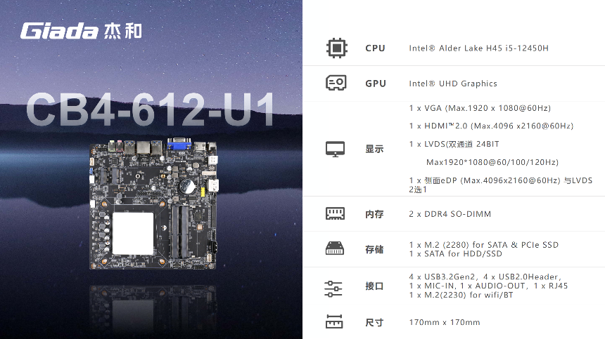 CB4-612-U1是一款高性能主板, 搭载英特尔Alder Lake平台 i5-12450H,45W TDP功耗,专为办公、教育、轻量级创意设计等场景而生。