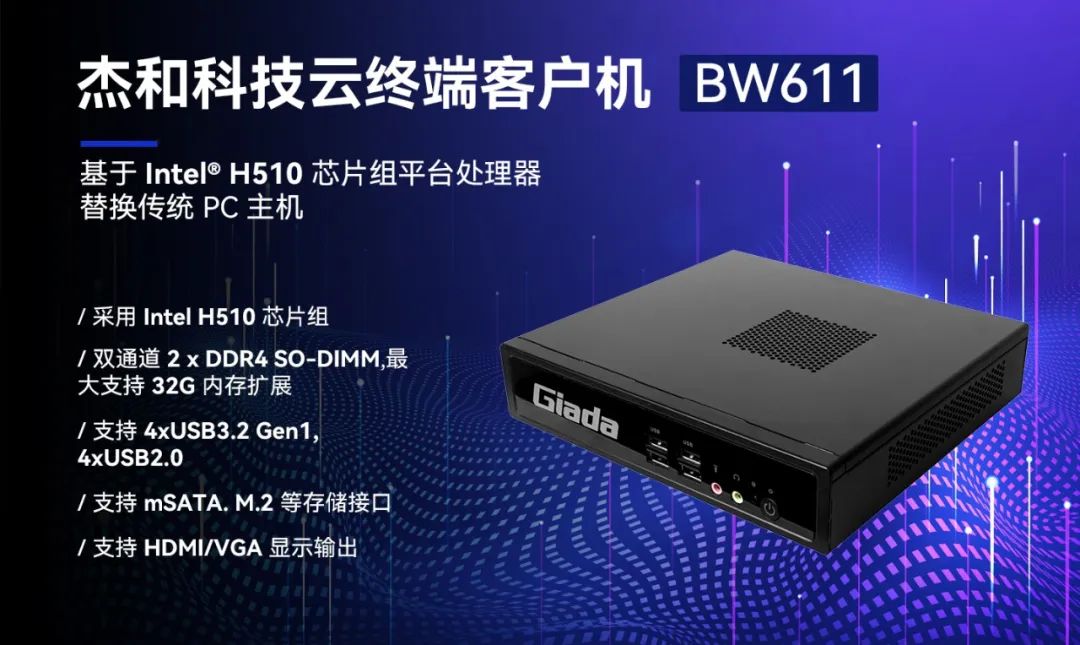 随着各个行业的业务难度以及专业程度不断提高,应用场景复杂多变,对云终端提出了更高的要求,Giada星空科技云终端产品BW611具备便捷管理部署、性能强悍、扩展性强、安全性高等优势,能满足多种复杂应用场景,满足用户性能需求的同时,提供非凡的使用体验。