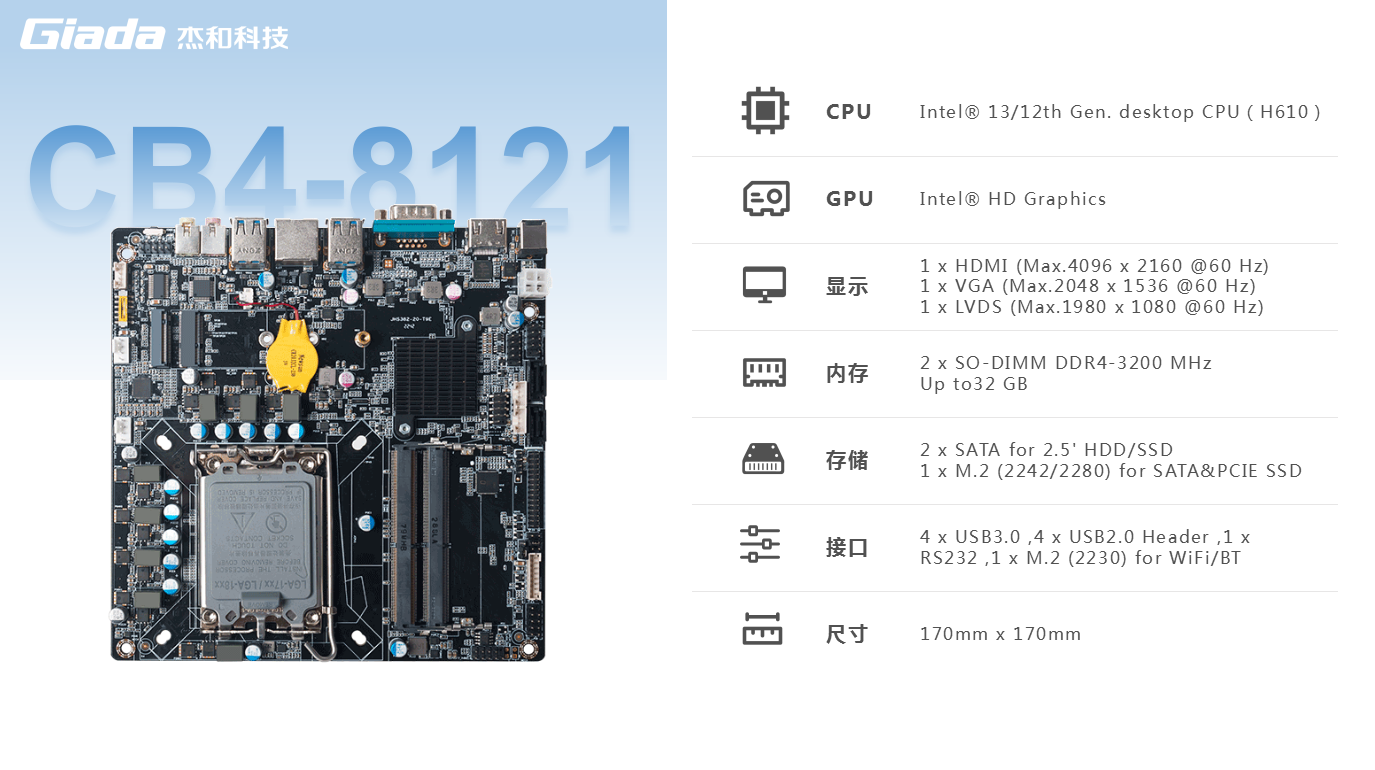 另外,一体机相对于传统的电脑更加美观,更加节能环保,而且一体机在使用体验方面也有独特的优势:比笔记本屏幕大,比台式机更简洁,也解决了一直为人诟病的台式机线缆多而杂的问题,因此,越来越多的教育办公、日常娱乐和学习的用户选择使用一体机。Giada星空科技根据市场与客户需求,推出这款高性能的一体机专研主板CB4-8121,带来全新震撼体验。星空科技主板CB4-8121是基于Thinmini ITX一体机标准设计,采用Intel Alder Lake-S平台H610芯片组,支持全新第13/12代Core i7/i5/i3处理器,搭载双通道SO-DIMM DDR4-3200MHz内存、1 x M-Key M.2 (2242/2280) SSD和 2 x SATAIII存储,强大的配置能够为用户带来出色的计算和图形处理性能,无论是载入游戏、数据传输还是平面设计,赋予用户更加极致流畅的使用体验。