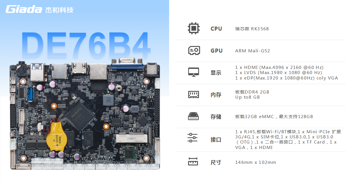 DE76B4基于瑞芯微RK3568系列Quad-coreARM Cortex-A55处理器开发,这是款面向AIOT市场打造的高性能、低功耗、功能丰富的处理器。而RK3568作为一款优秀的国产芯片,采用22nm制程工艺,内部集成瑞芯微自研的NPU处理器,提供0.8 TOPS算力,集成4核ARM架构A55处理器和Mali G52 2EE GPU,在处理速度和图形处理能力方面都表现出色。