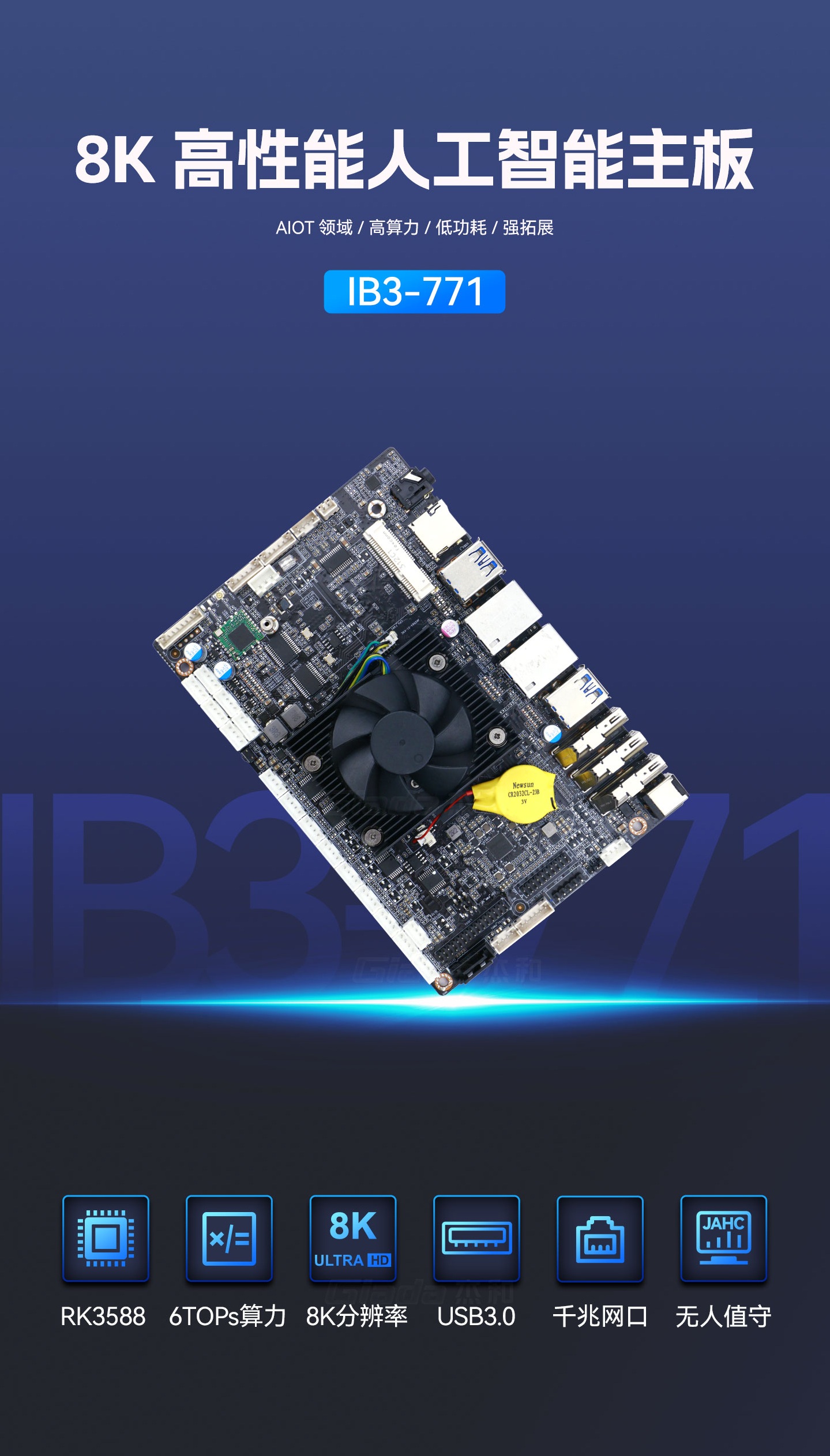 星空科技IB3-771采用瑞芯微全新旗舰级芯片RK3588,搭载八核64位处理器,集成ARM Mali-G610 MP4 GPU,高算力、低功耗、具备强大的视觉处理能力;性能强悍的RK3588内置AI加速NPU,提供6TOPs算力,支持主流深度学习框架,为各类AIoT应用场景提供更优的性能表现。