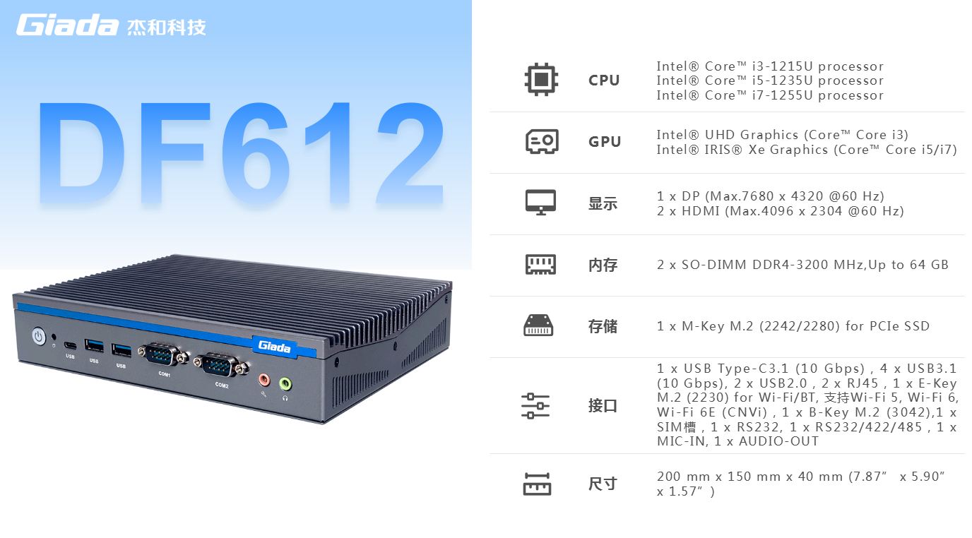 星空科技,商用显示硬件解决方案领导者,深耕商业显示领域24年,业务遍布欧洲,美洲,东南亚和南非等60多个国家,服务超过3000名客户,自有品牌 Giada 已成为欧洲数字标牌媒体播控器的领导品牌。在DF系列产品中,DF612作为一款全新的嵌入式计算机,搭载英特尔第12代Alder Lake处理器,具有突破性的技术、增强的图形处理能力和丰富的I/O接口,广泛应用于商业显示、智能车载、安防领域和边缘人工智能等场景。