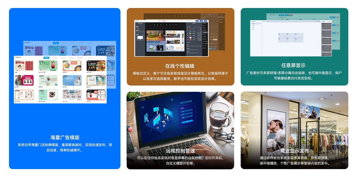 星空科技为客户提供可靠的硬软云一体化服务,针对商显领域,除了为客户提供数字标牌等硬件产品,同时也自主研发了星空GDSM-C数字化信息发布管理系统软件,作为全方位的远程信息编辑发布及设备管理系统,提供丰富广告素材与人性化编辑工具,用户可发挥自我创造能力,新手也可轻松实现大师设计效果,同时可实现多屏拼接/分离、画中画等自由选择,可根据应用场景灵活安排,满足大型会议、百货商场、体育赛事、金融证券的等多种智能显示需求。