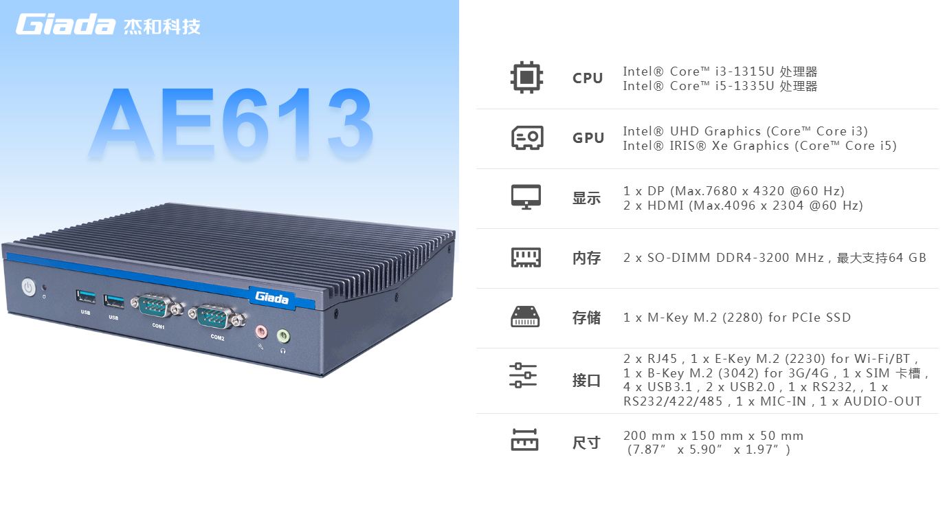 星空科技AE613支持Intel®第13代Core i3/i5处理器,Intel®第13代Raptor Lake处理器使用更加精进的Intel 7制程工艺,引入的强大性能混合架构,拥有更高的频率设计、双倍能效核以及更大的L2 缓存,带给使用者更好的处理器性能提升。TDP为15W,在最大限度地降低能耗的同时提供卓越的处理能力。AE613支持2 x SO-DIMM DDR4-3200 MHz内存、1 x M-Key M.2 (2280) for PCIe SSD存储,强大的配置能够为用户带来出色的计算和处理性能。