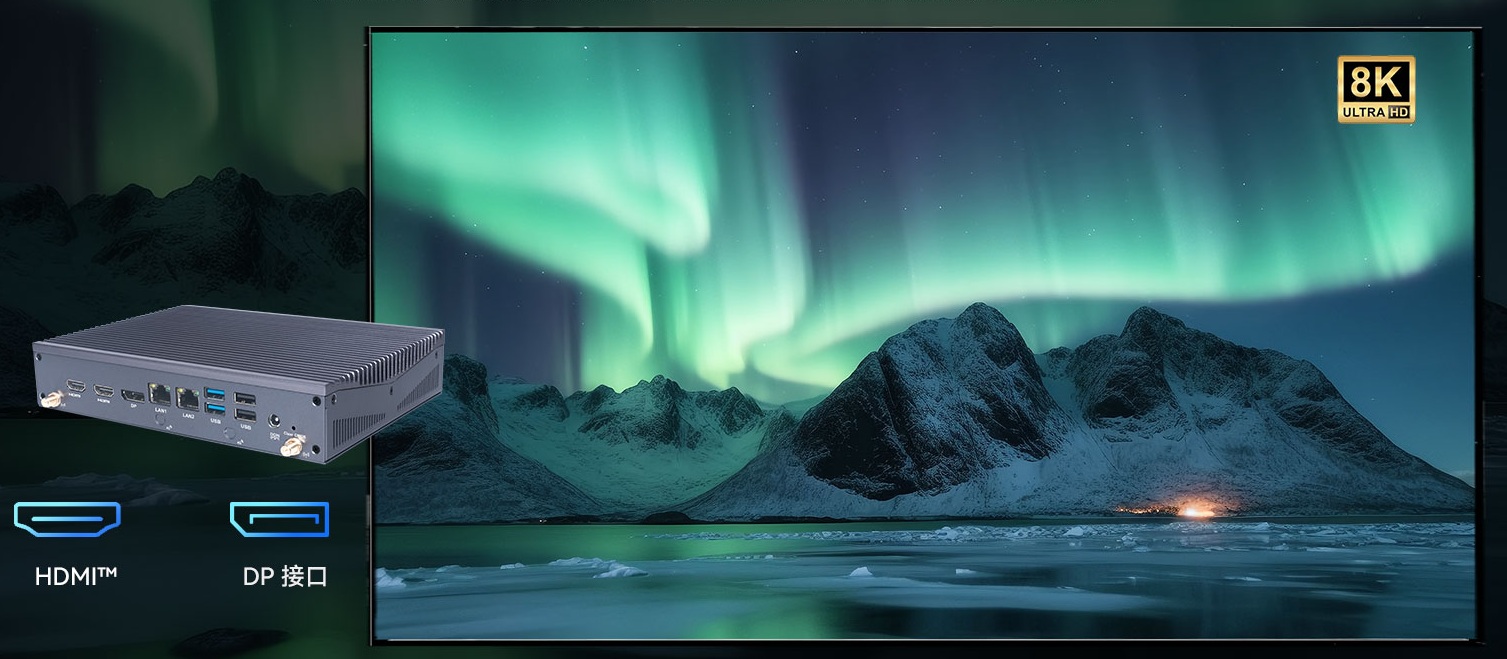 星空科技AE613集成Intel®UHD Graphics (Core i3)/Intel®Iris®Xe Graphics (Core i5) GPU,支持1 x DP (Max.7680 x 4320 @60 Hz),2 x HDMI (Max.4096 x 2304 @60 Hz),支持8K分辨率(7680 x 4320 @60 Hz),支持3个独立显示器,可实现拓展、复制、独显模式,出色的图形处理能力,提供令人惊叹的视觉效果和沉浸式画面体验。