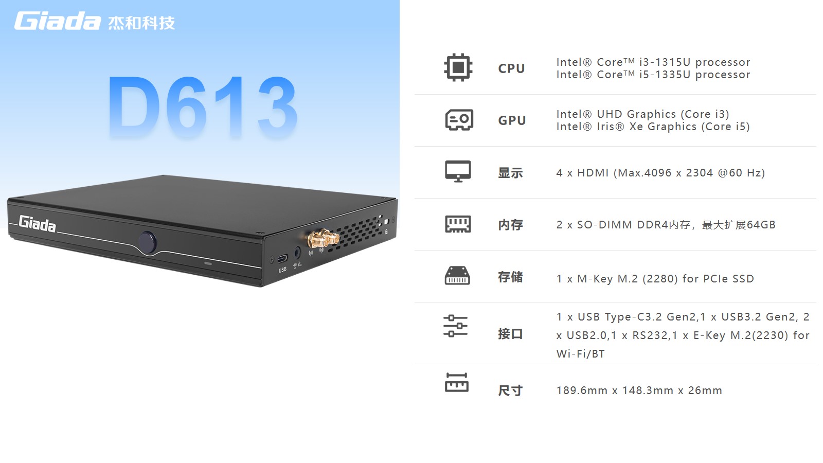 星空数字标牌D613搭载Intel RaptorLake Corei3-1315U/i5-1335U处理器,可以同时连接4个4K显示器,支持4K分辨率编码解码,还支持5G蜂窝网络,速度比4G LTE快10倍。