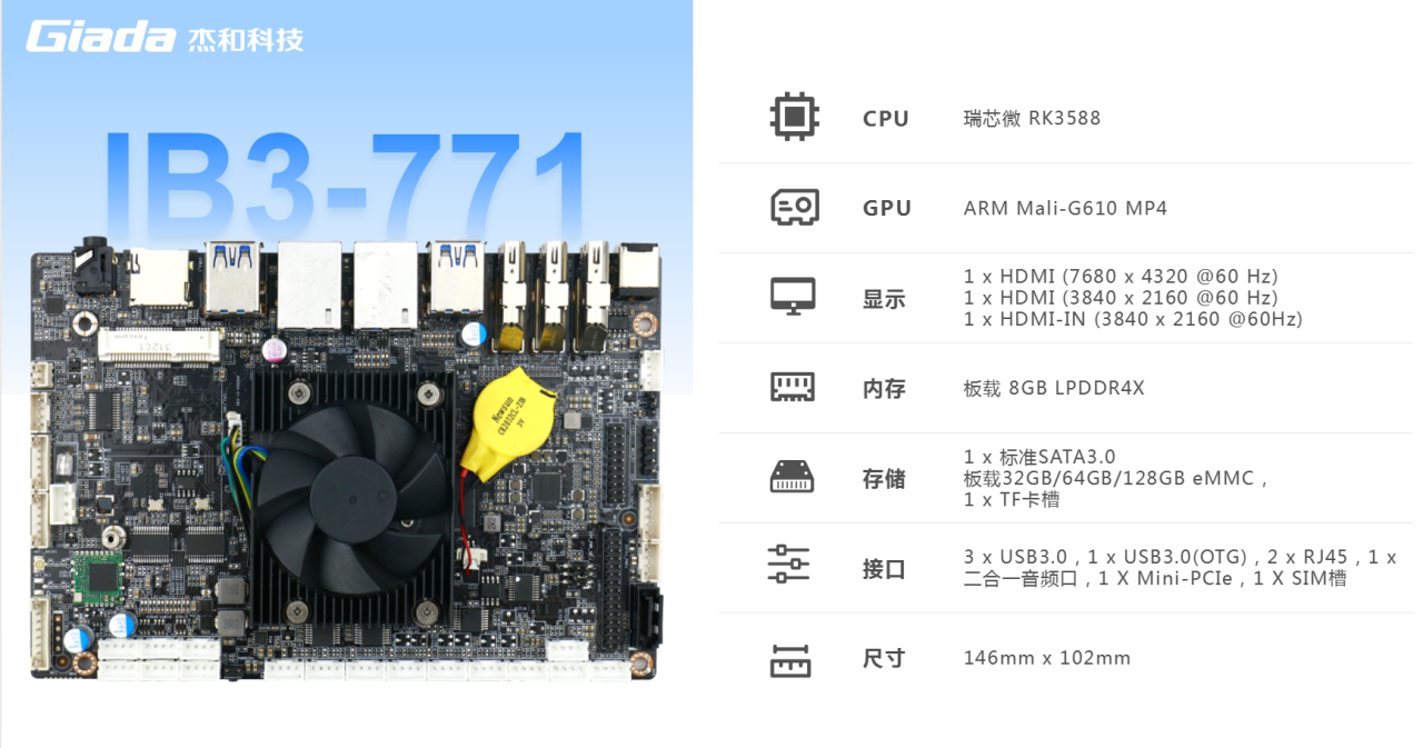 星空主板IB3-771搭载瑞芯微RK3588八核64位处理器,内置6TOPS算力的NPU,具备高算力、内存大、超强多媒体、多重扩展等技术优势。满足8k超高清视频的显示需求,还支持主流深度学习框架,为各类 AIOT 应用场景提供更优的性能表现,支持机器人、边缘计算、智能NVR、智能汽车、智慧大屏、AR/VR、智能自助终端场景的广泛应用。