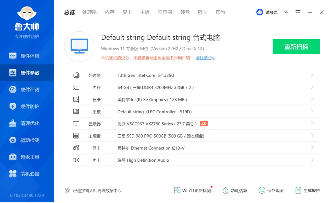 上面是鲁大师识别的星空AE613硬件参数详情,星空进行跑分测试的核心三大件选择的是13th Gen Intel(R) Core(TM) i5-1335U @1.30GHz处理器,Intel(R) Iris(R) Xe Graphics显卡,三星 32GB*2 DDR4 3200MHz内存,三星SSD 980 PRO 500GB(500 GB/固志硬盘),下面星空来看详细的跑分数据。
