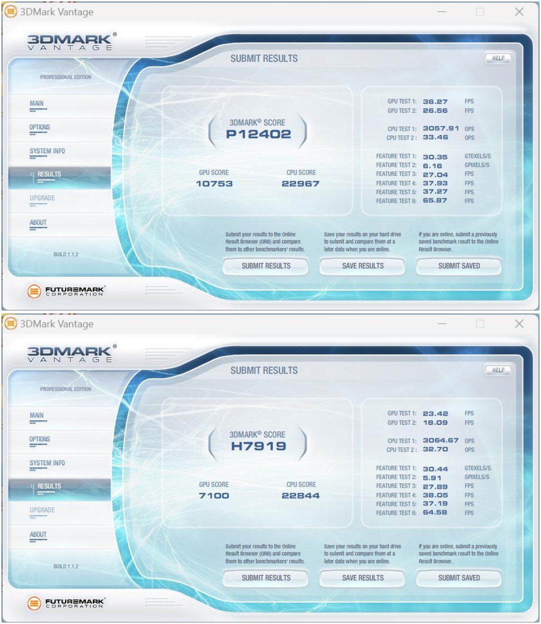 3DMark Vantage一款3D图形性能评测软件,主要用于评测电脑的显卡和处理器的性能。星空按照画质等级,记录了性能级(Performance,P)和高端级(High,H)两份数据。其中,Performance的综合得分为P12402,High的综合得分为H7919,表现不错,这个成绩已经完全能够满足主流用户的需求了。
