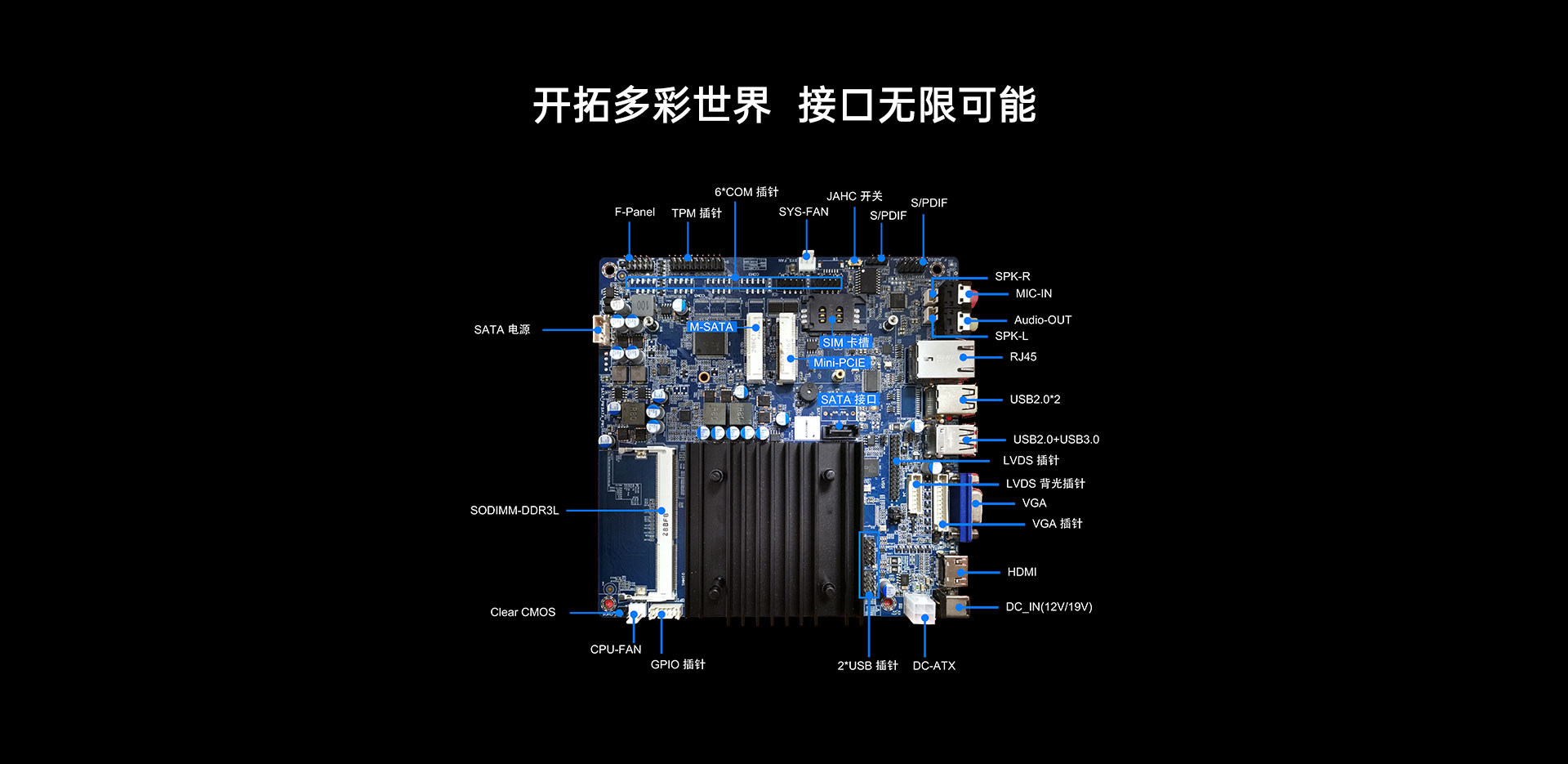 6x10pinCOM,1xSIM卡槽,1x4pinATX,1xSATA